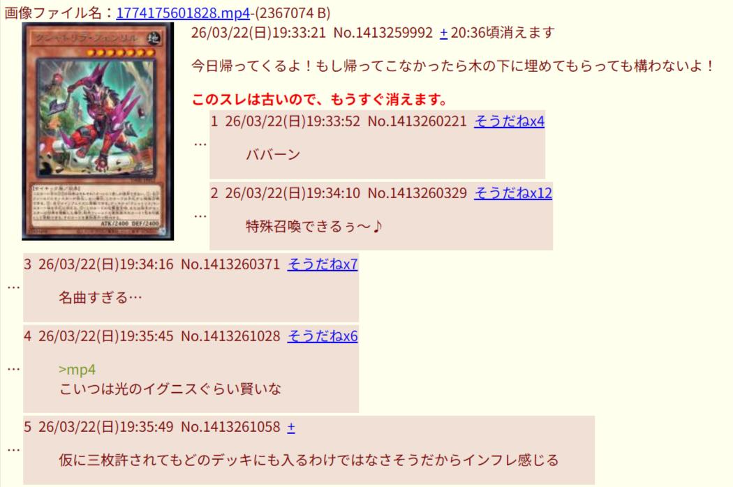 | … | 85526/03/22(日)21:55:07 ID:uSb8.33wNo.1413326893+キラーチューンとかいうクソデッキが環境トップになりそうで… |