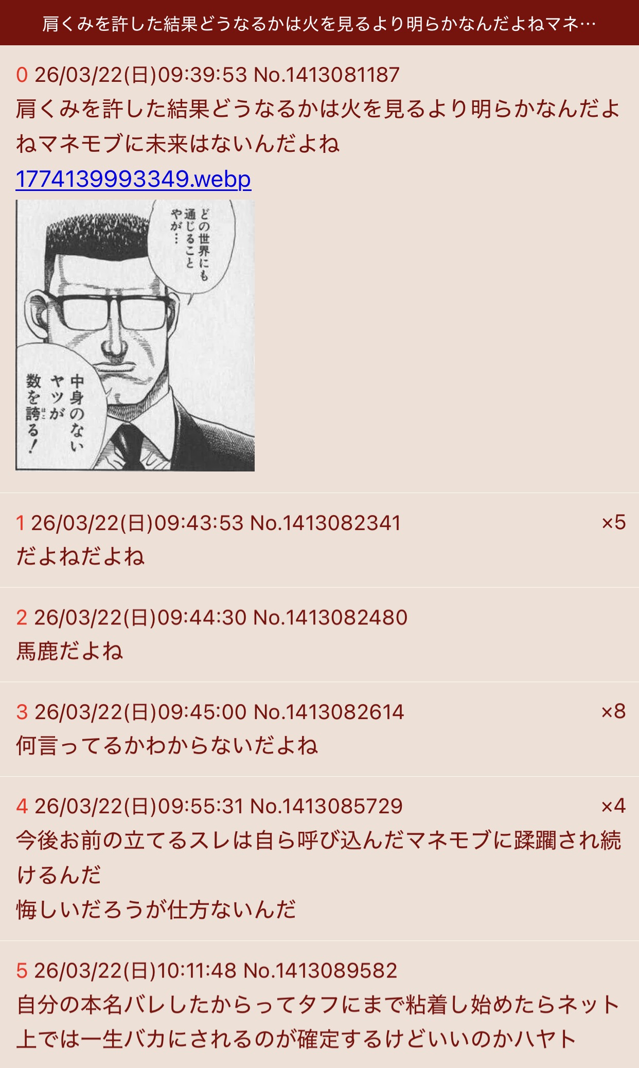 | … | 9026/03/22(日)21:56:42No.1413327536そうだねx1ひたすら自演で暴れても誰もお前に賛同しないよ |