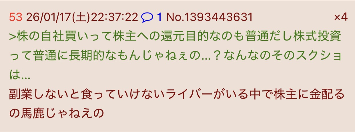 | … | 25526/03/22(日)22:27:29No.1413339653そうだねx6株式会社が株主に金配らなかったらそれはもう株式会社じゃないだろ… |
