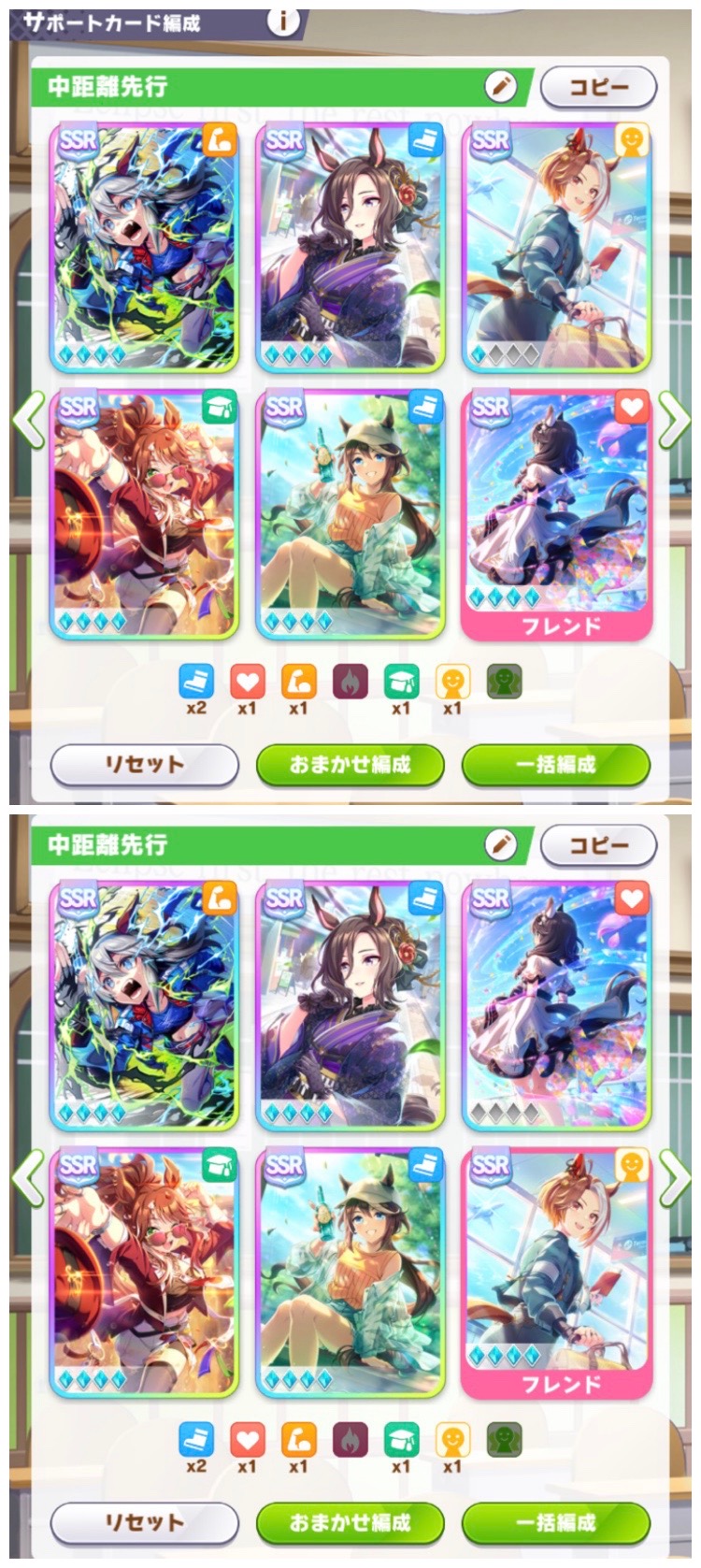 | … | 7826/03/22(日)22:14:15No.1413334619+>>つかぬことを聞きますがサポカ編成は上と下どっちがいいですかね? >>カジノさんとブーケさんどっちの完凸を借りるかというだけなんですが >画像貼り忘れちゃいました >えへへ >fu6450561.jpg カジノさんは自前で無凸あればいいですにょ |