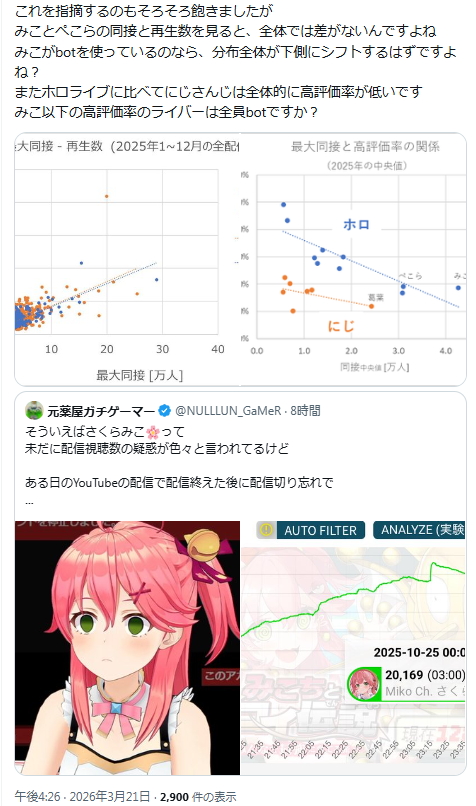| … | 98026/03/23(月)01:10:52No.1413391786+>スレ画のそもそもの言いがかりは「配信切り忘れの真っ黒画面を2万人も見てたのはおかしい!」と言い出したことなんだけど |