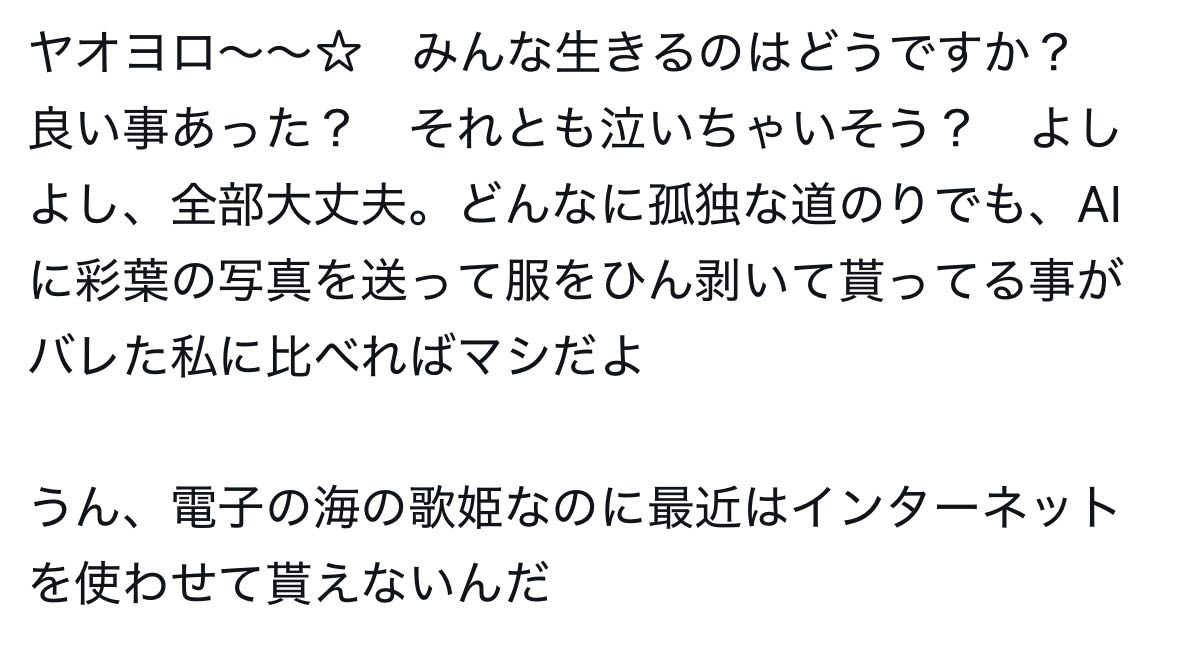 | … | 4726/03/23(月)18:39:21No.1413548892+Yachi8000の蛮行がだいぶ浸透してきたからイメージがネットに強い歌姫になってきたのよ… |