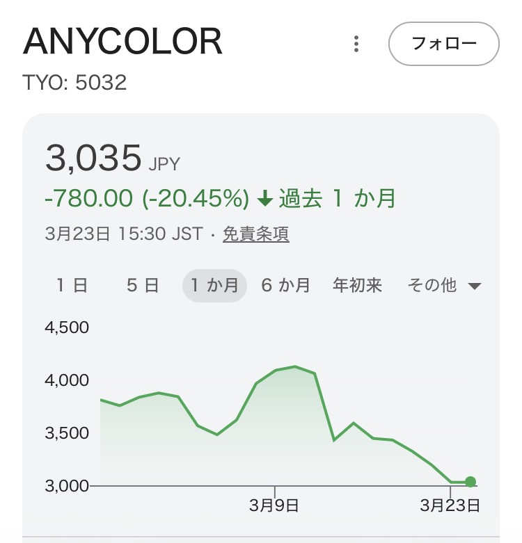 | … | 6526/03/23(月)19:33:43No.1413565663+>エニーカラー株ってギリ4000円台は維持すると思ってたらかなりのスピードでもう3000円台突入寸前なんだな |