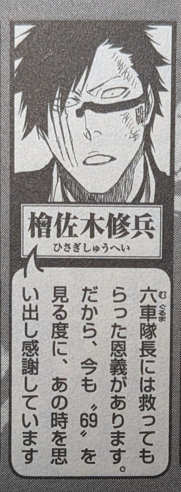 | … | 23426/03/24(火)00:27:03No.1413686666+69は六車九番隊だからって拳西が胸に69刻んでたのを見てそれが焼き付いてるからだ |