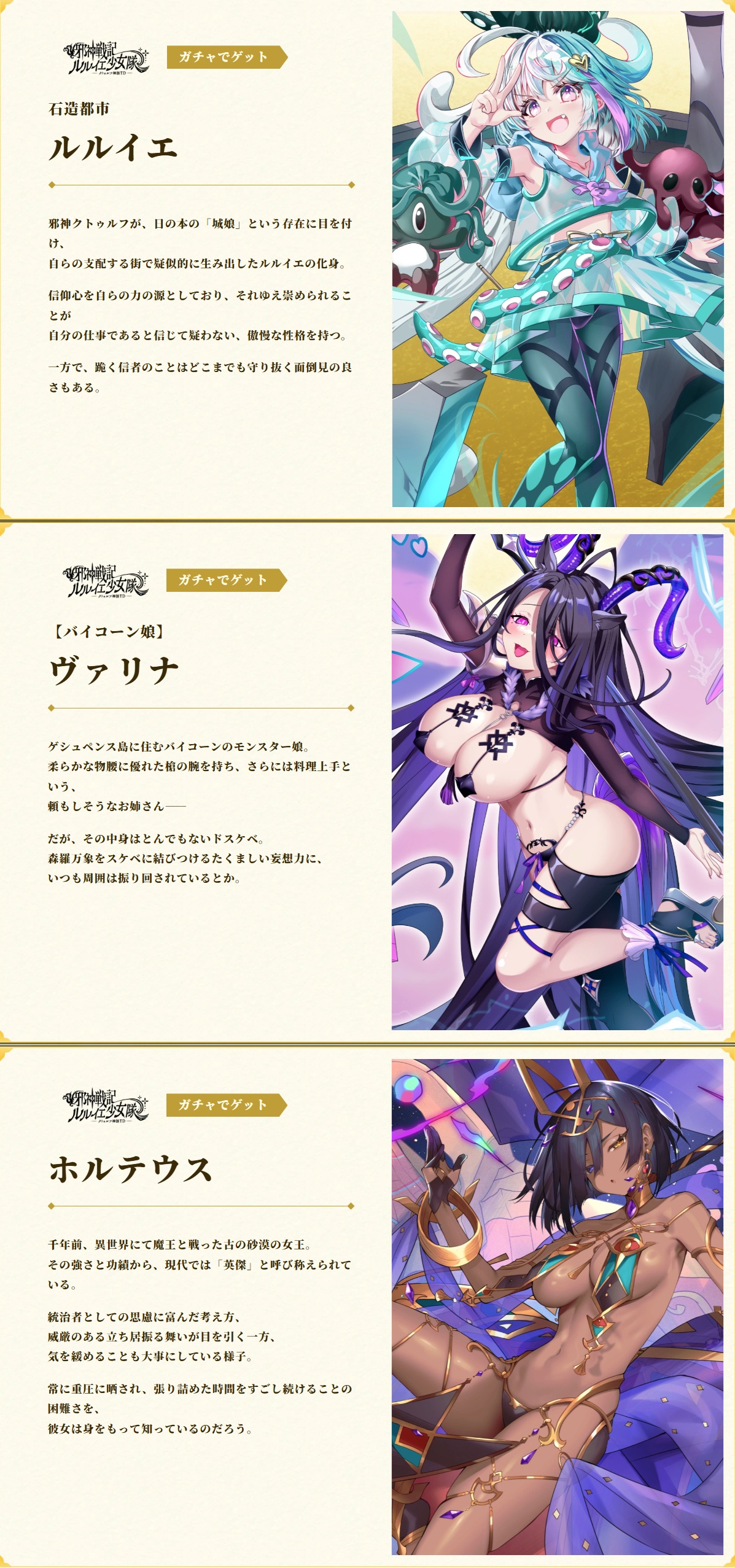 | … | 79026/03/24(火)09:27:49No.1413732748+>邪神クトゥルフが、日の本の「城娘」という存在に目を付け、 >自らの支配する街で疑似的に生み出したルルイエの化身。 > >信仰心を自らの力の源としており、それゆえ崇められることが >自分の仕事であると信じて疑わない、傲慢な性格を持つ。 > >一方で、跪く信者のことはどこまでも守り抜く面倒見の良さもある。 これ要はここのクトゥルフ様がこのルルイエちゃん作ってるのだ? |