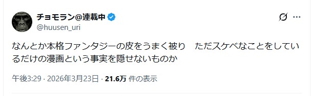 | … | 22026/03/24(火)09:55:45No.1413737237+余りにも己の性癖優先過ぎて読者のこと一瞥もしない潔さは感じる |