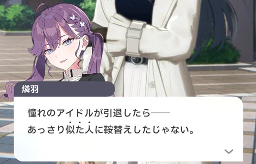 | … | 28026/03/24(火)13:48:51No.1413790042+>なぜ咲季のストーリーで燐羽の掘り下げを…? |