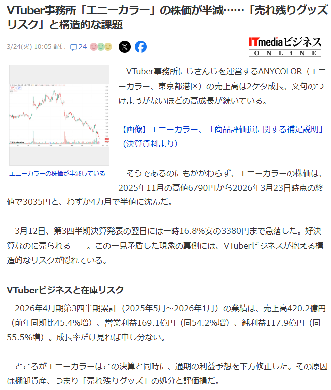VTuber事務所「エニーカラー」の株価が半減……「売れ残りグッズリスク」と構造的な課題