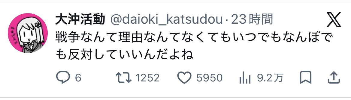 | … | 4026/03/24(火)13:41:49No.1413788564+我々の戦争反対は正義の主張でお前らの戦争反対はファシズムだ |