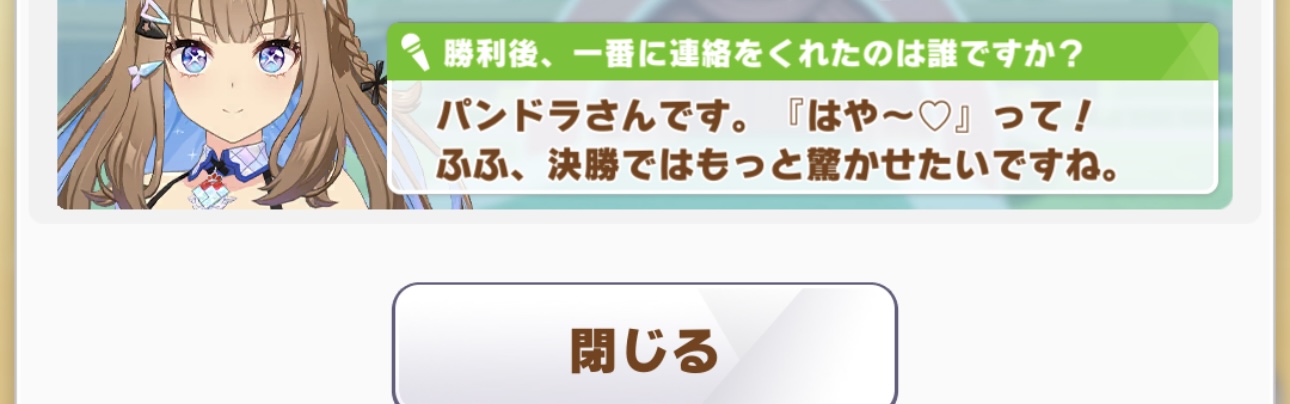 | … | 7526/03/24(火)15:19:58 ID:W3Q1SbH.No.1413808310+勝負服とかあるんですか私…何の勝負で? |