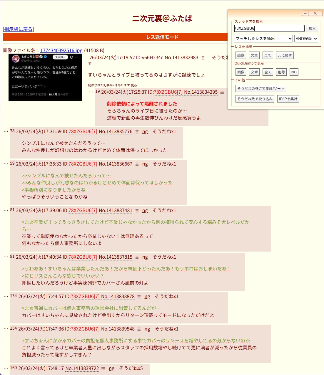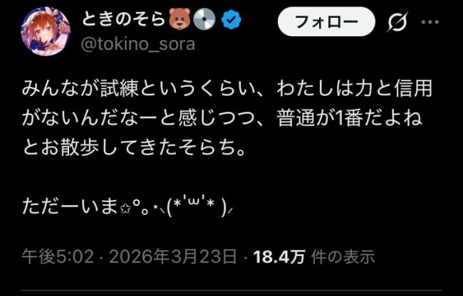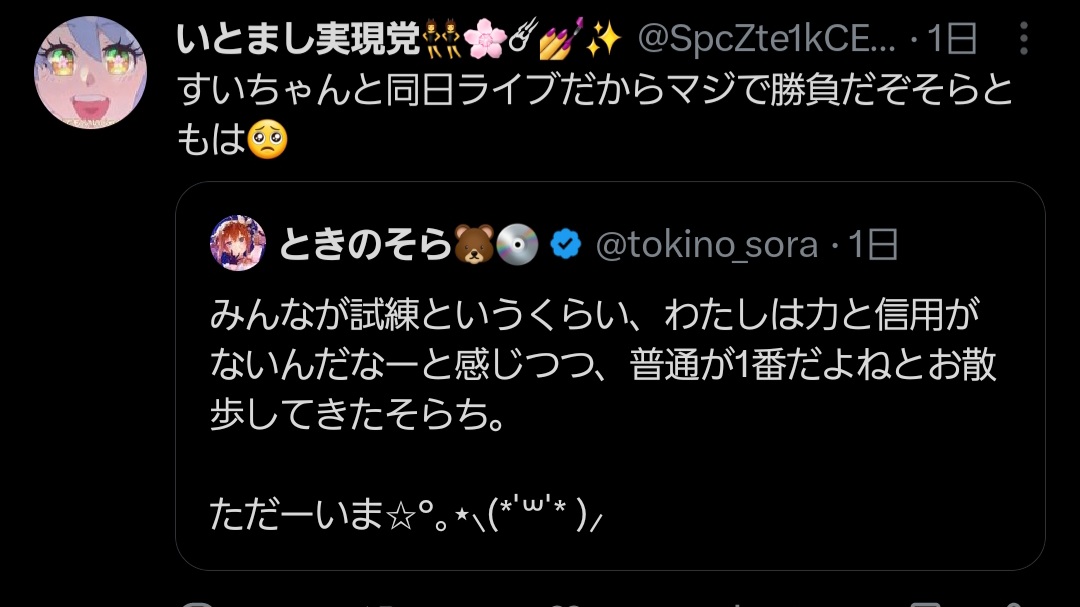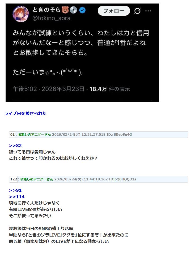 | … | 2026/03/24(火)17:26:06No.1413834394そうだねx16>そらちゃんのライブ日に被せたのか… |