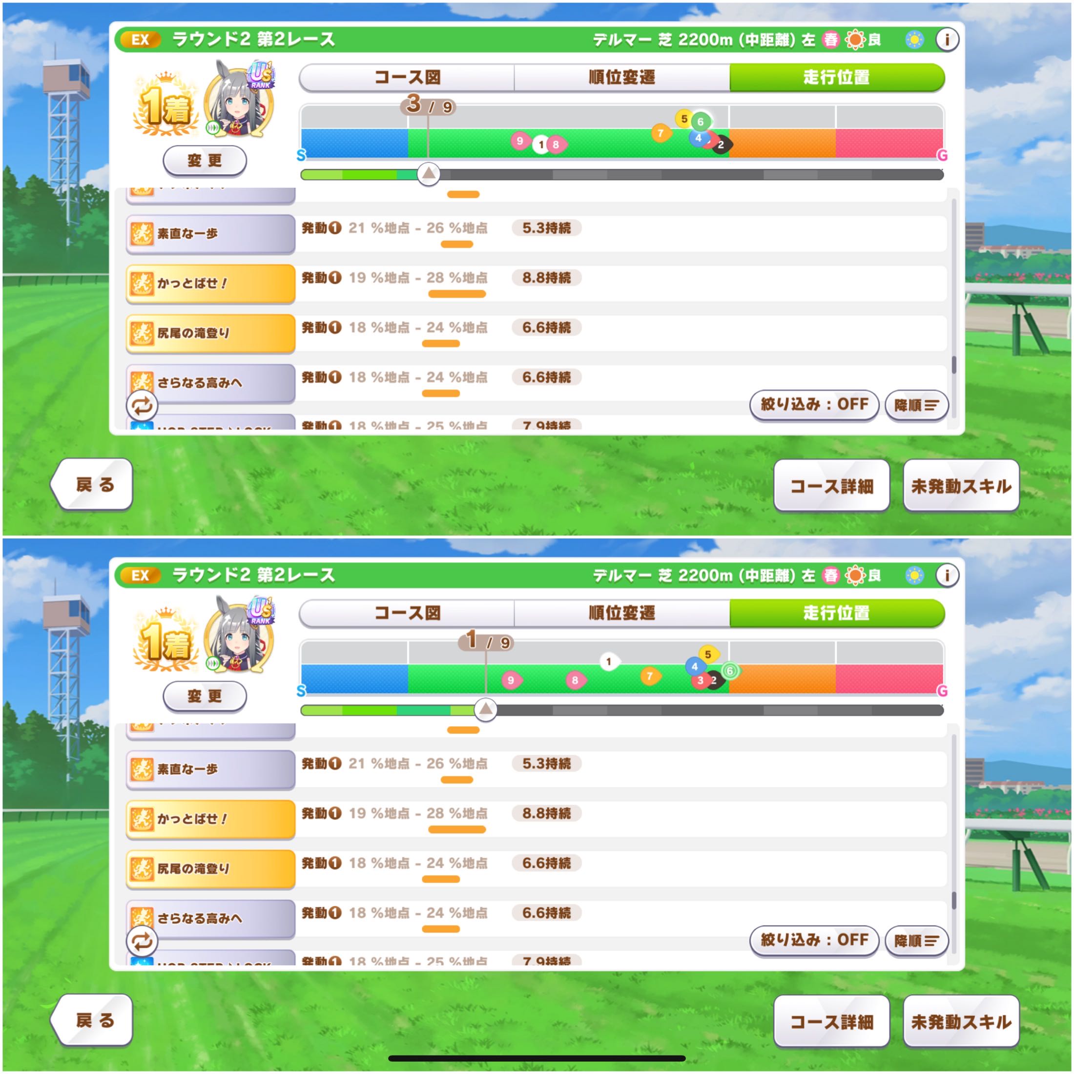 | … | 34926/03/24(火)20:15:52No.1413885578+序盤から先行がケツの方走るとスキル未発動の数がすごいことになるのだワハハ |