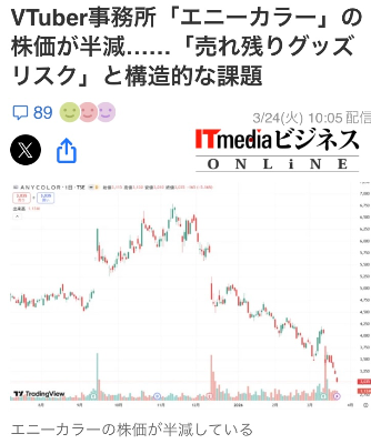 | … | 3326/03/24(火)20:19:24No.1413886828そうだねx2>VTuber事務所「エニーカラー」の株価が半減……「売れ残りグッズリスク」と構造的な課題 |