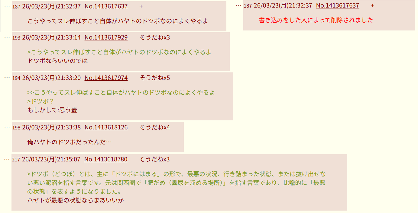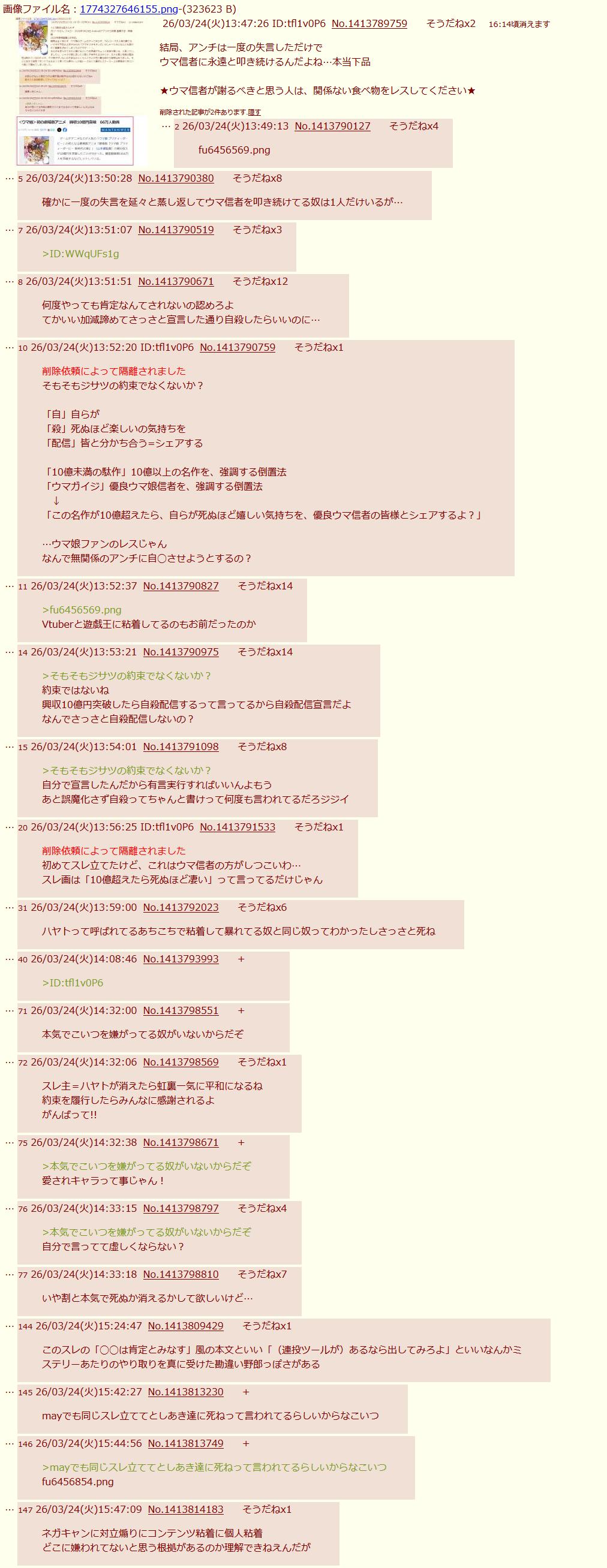 | … | 2526/03/24(火)20:15:34No.1413885470+>ハヤト連呼がおかしいことと |