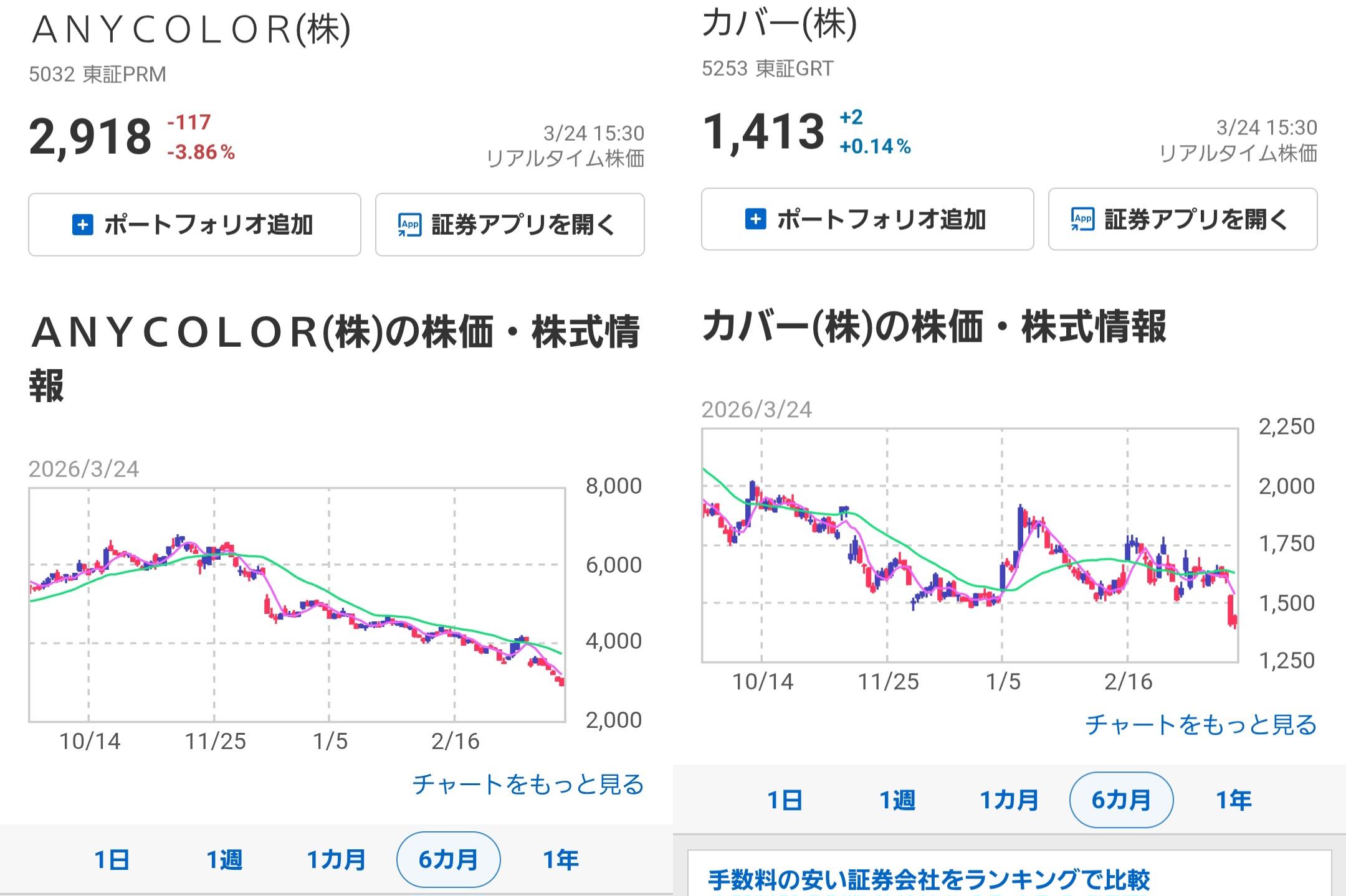 | … | 6526/03/24(火)19:59:11No.1413879664そうだねx15>>真面目にカバーと比べるとえにからの方が株価倍以上下落してるけどいいのか? |