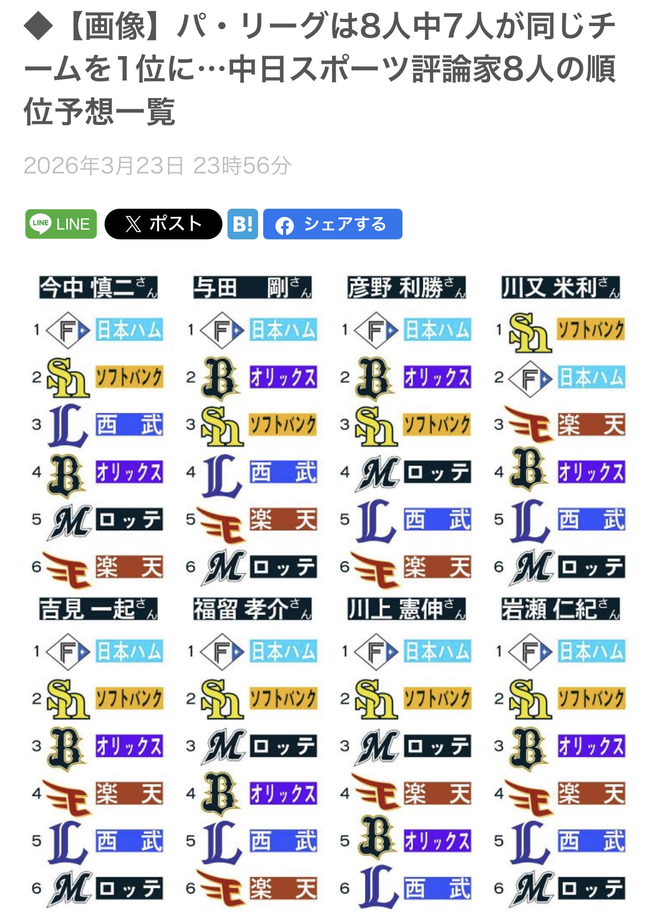 | … | 126/03/24(火)21:54:10No.1413924574+ソフバンとハムはなんだかんだ仲良しだな |