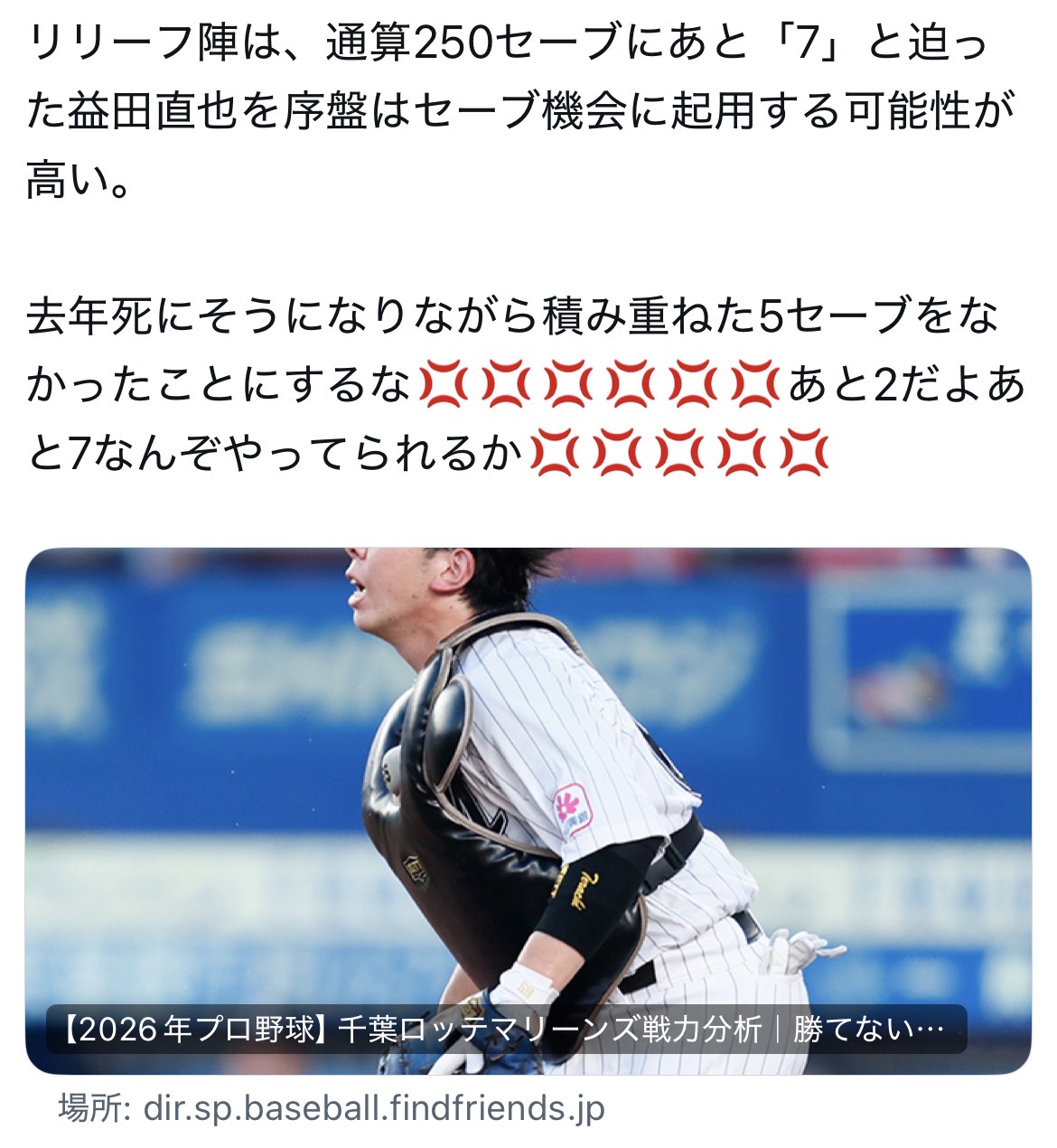 | … | 4526/03/24(火)22:03:44No.1413928762+WBC組が開幕投手務めてる球団も幾つかあつけど急ピッチで仕上げてるような状態だからこれもこれで大変そうだ |