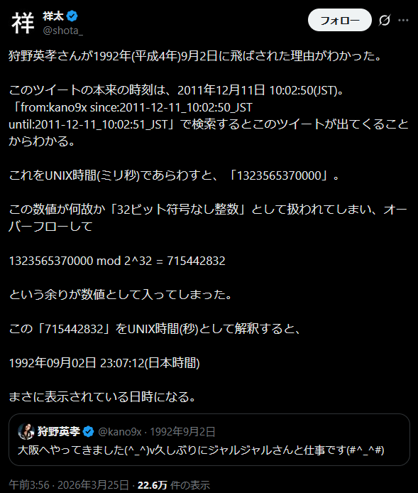 | … | 18626/03/25(水)09:35:34No.1414036428+UNIX時間周りのバグは割といろんなパターン見てきたけどこれ本当に初めて見た |