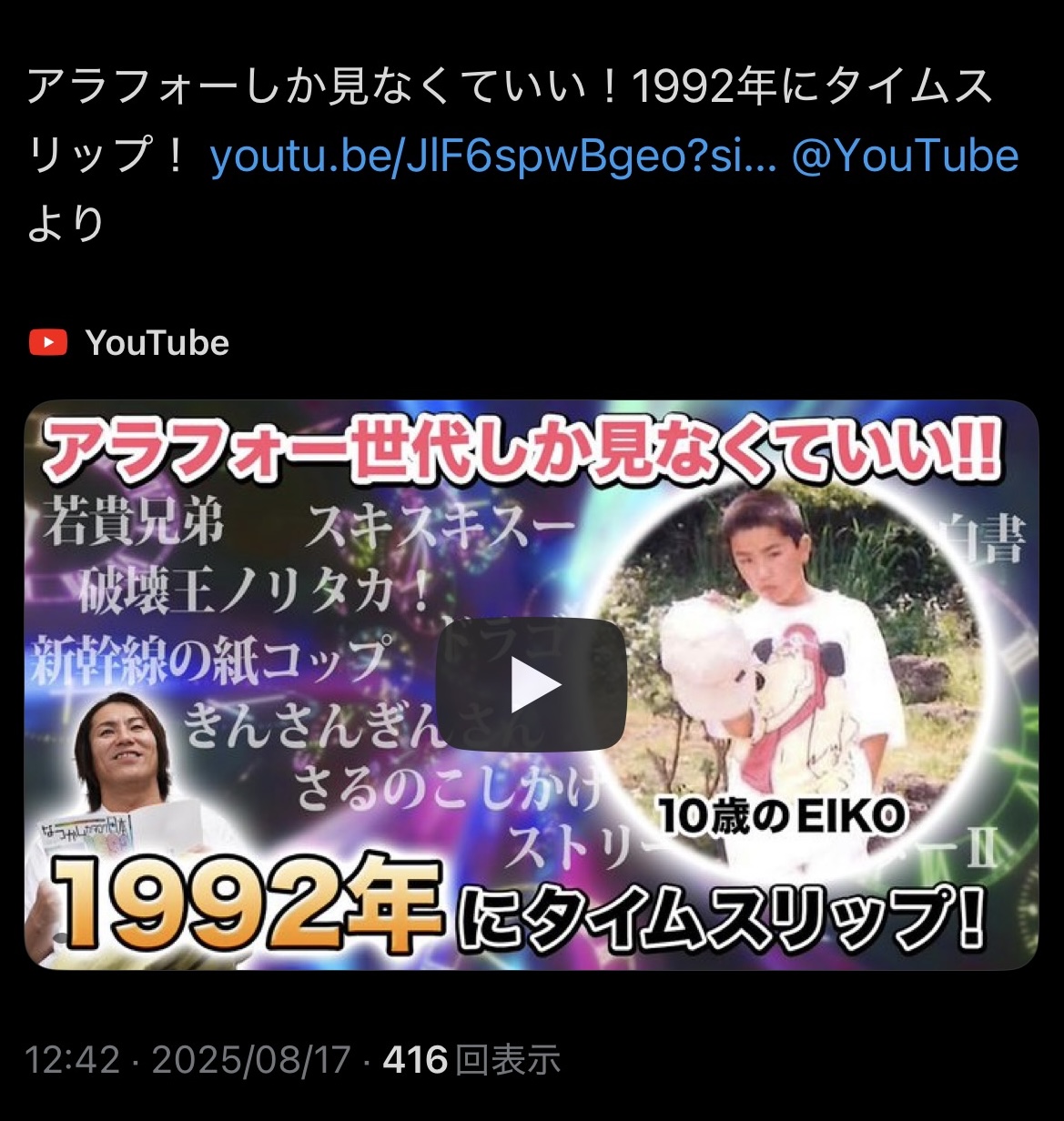| … | 19526/03/25(水)09:49:10No.1414038547+そもそもなんで2011年に1992年に飛ばされてることを今気づいたんだ… |