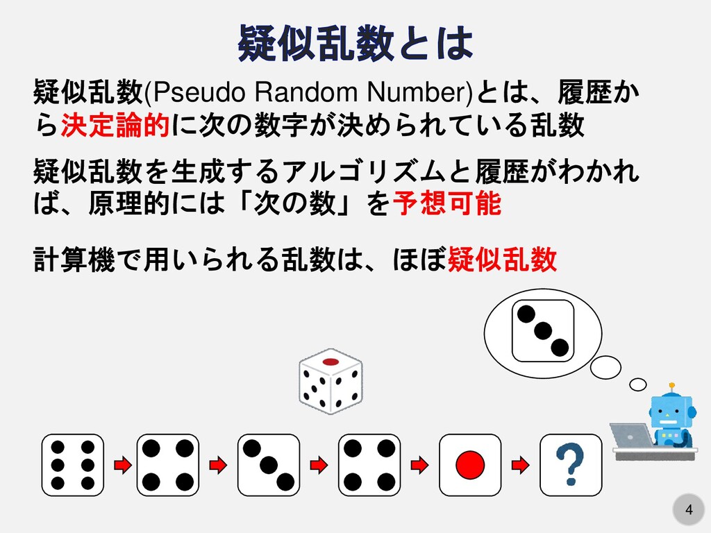 | … | 12826/03/25(水)16:09:18No.1414118134そうだねx5>どうせ人間には区別がつかないから真の乱数を一度だけ生成してシードにして後は疑似乱数でいいよね |