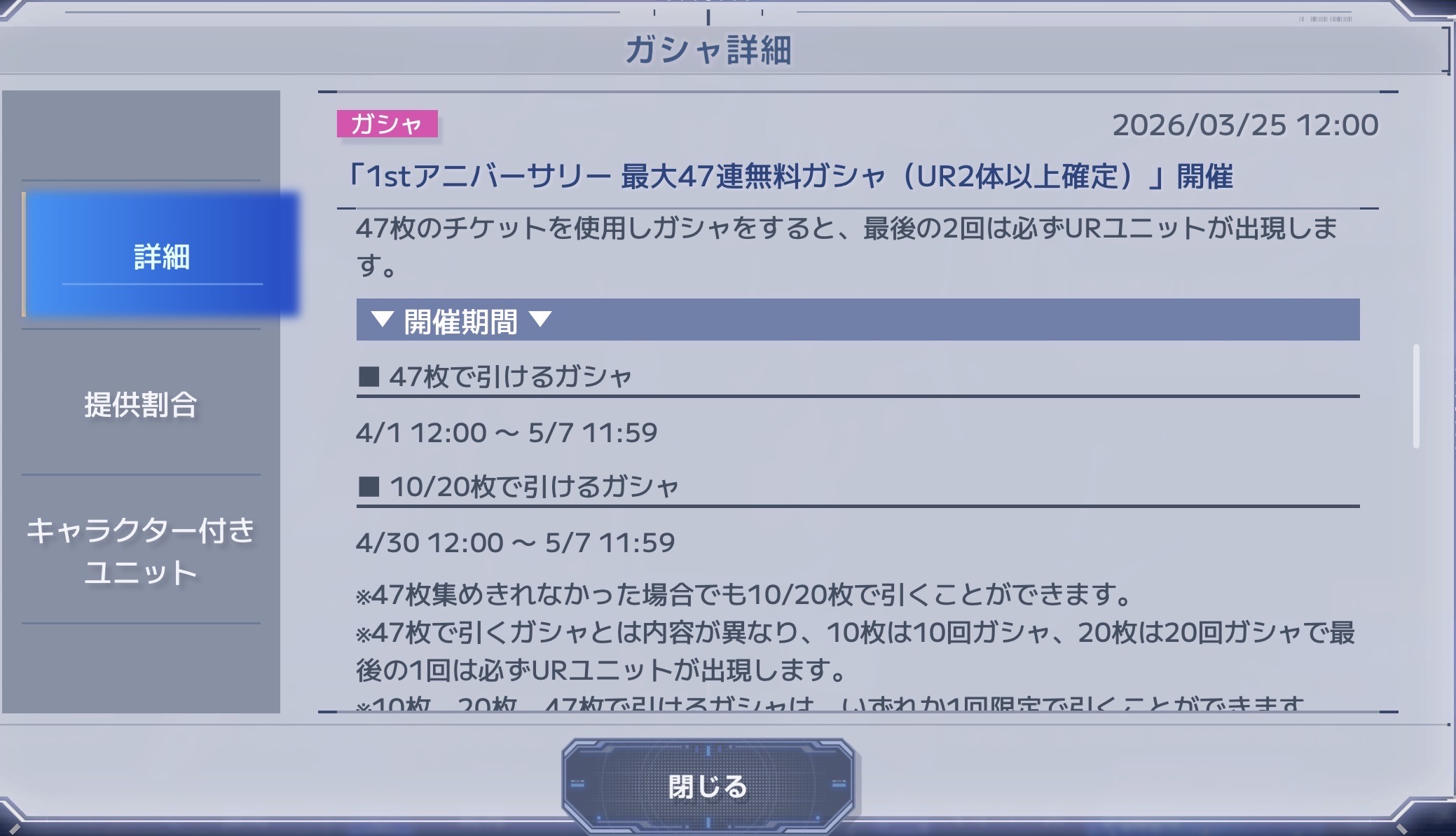 | … | 21826/03/25(水)16:37:49 ID:toVwCsP.No.1414123296+一体UR確定ガシャは47連の結果を待ってからの方がどう考えても賢いのだから… |