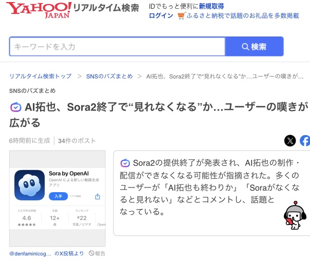 | … | 7226/03/25(水)18:37:30No.1414153017そうだねx3>Yahooリアルタイム検索…急に拓也言い出した… |
