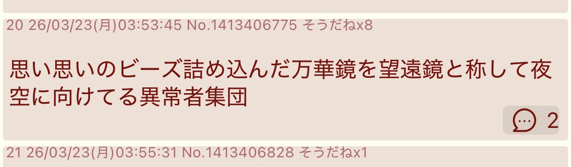 | … | 2926/03/25(水)18:16:14No.1414146529そうだねx2>天体観測は関係ないだろ! |