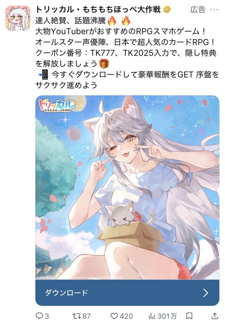 | … | 90926/03/25(水)21:58:08 ID:jAOhUeh6No.1414234707そうだねx1>トレンド1位と3位はちゃんとした人気ゲームでびっくりしたにゃん… |
