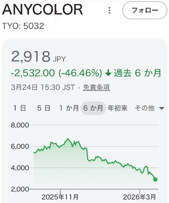 | … | 32226/03/25(水)21:54:59No.1414233533+VTuber事務所「エニーカラー」の株価が半減……「売れ残りグッズリスク」と構造的な課題 |