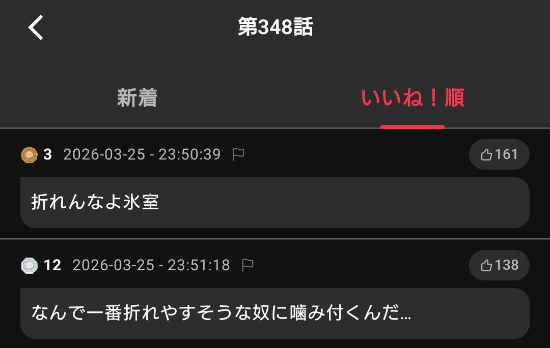 | … | 8026/03/26(木)00:15:25No.1414283403+ここで若槻が勝っても順当すぎてなんの意味もない戦いになっちゃうから氷室勝つよ |