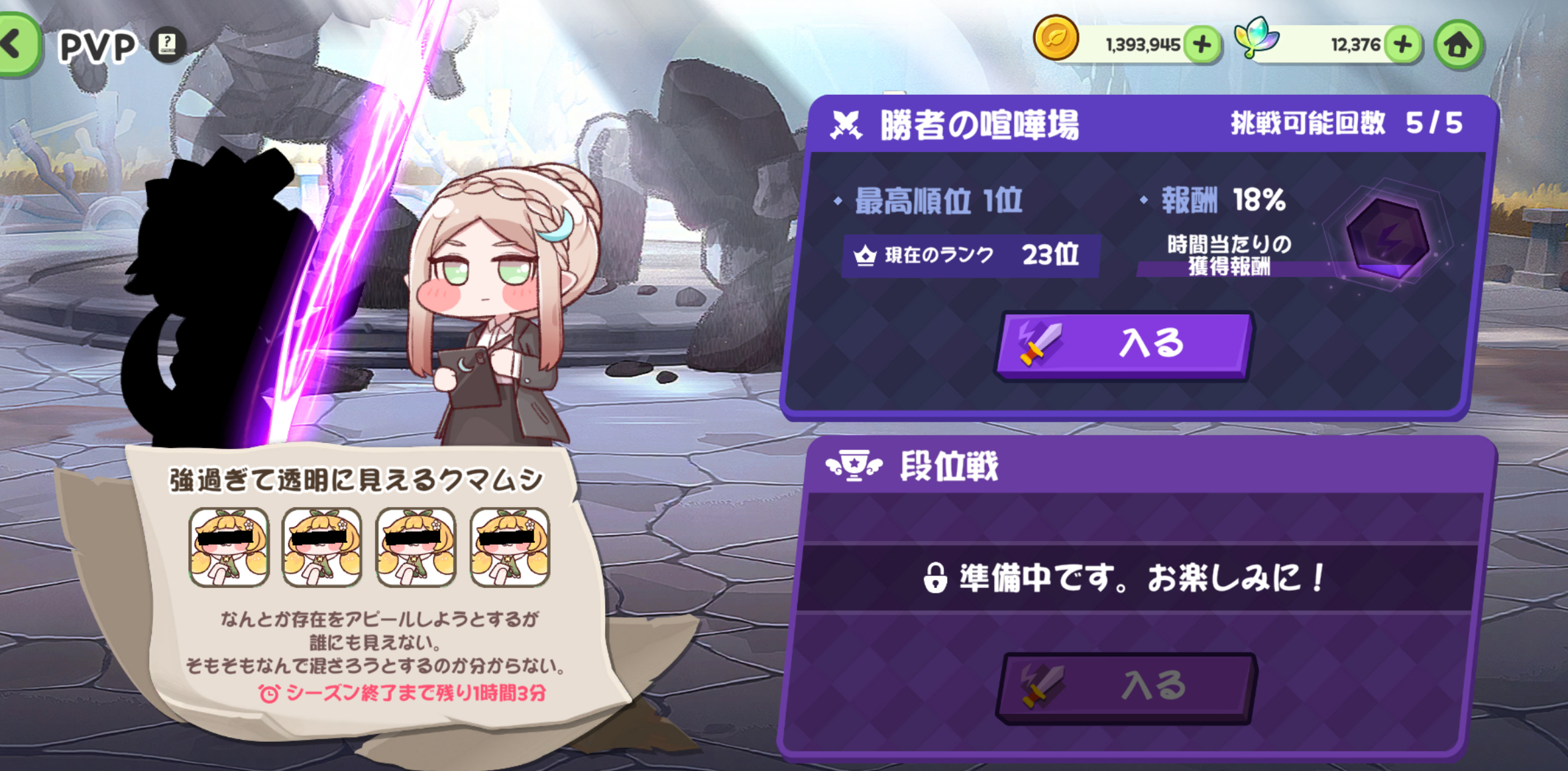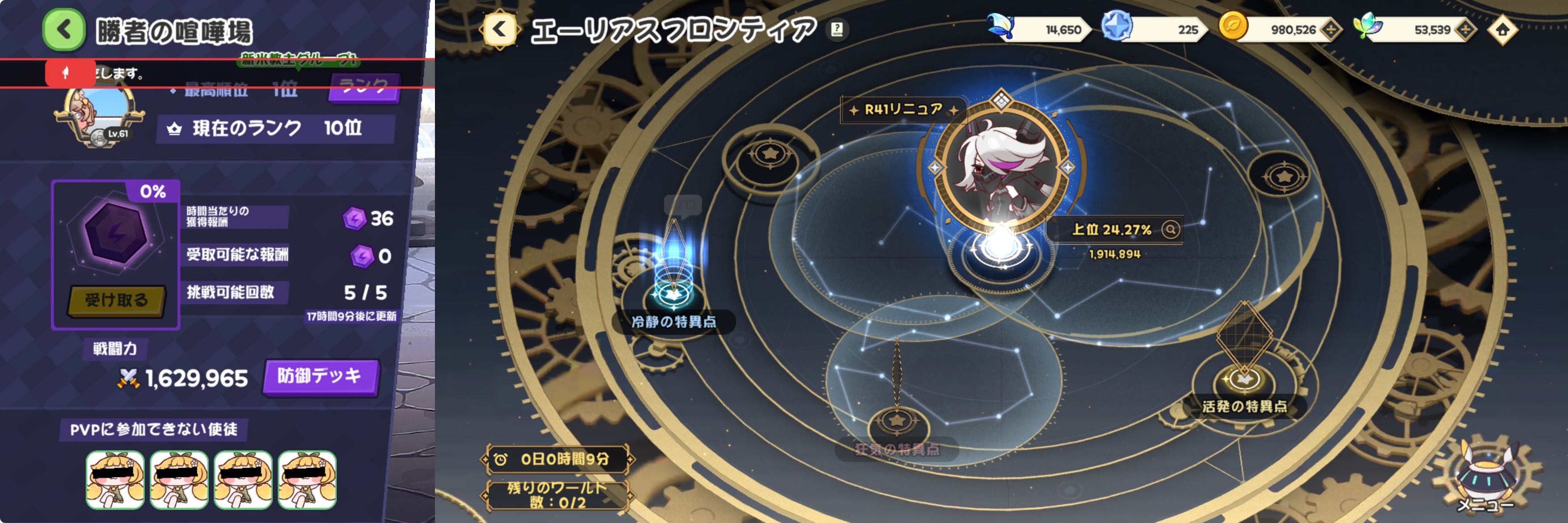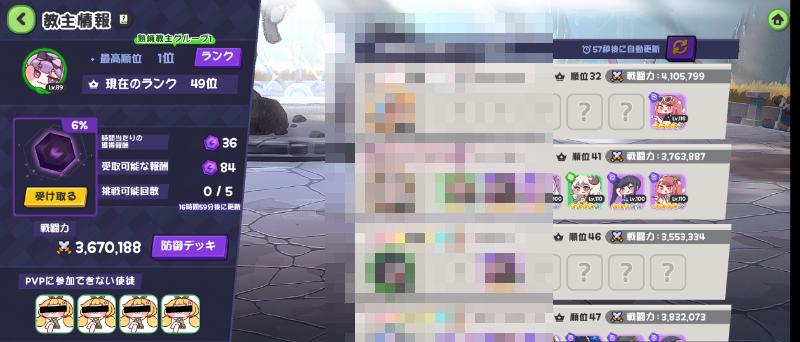| … | 88426/03/26(木)11:46:11 ID:65GN8oaYNo.1414361280+喧嘩場ギリ50位から弾かれて石割ったけど同編成の戦力下相手に全然勝てず時間切れにゃん |