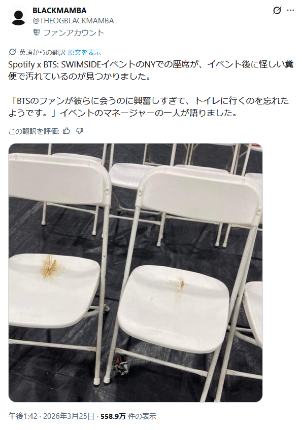 | … | 926/03/26(木)08:11:17No.1414327332+BTSってことは女の子達のうんこだから大丈夫だろ |
