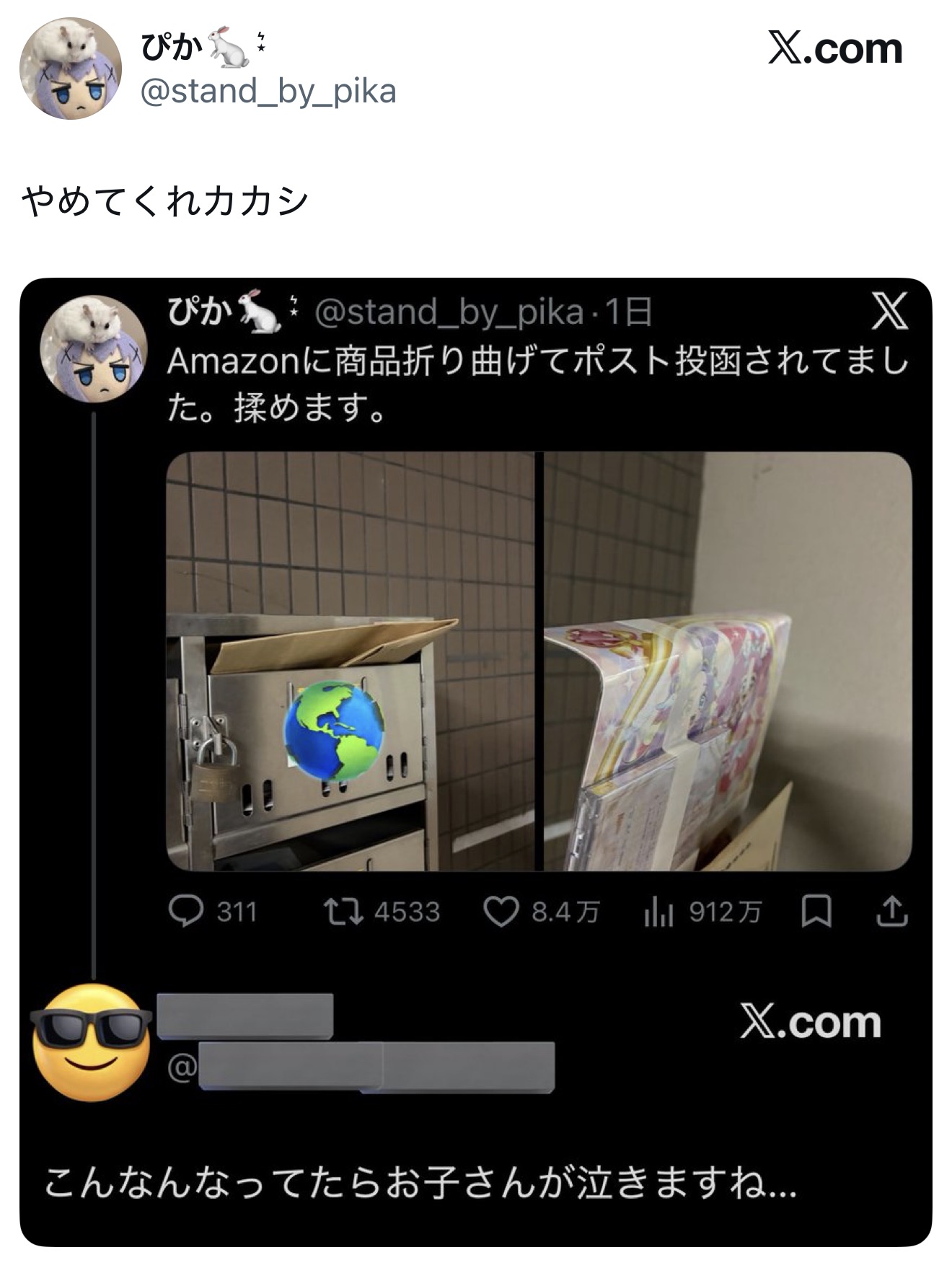 | … | 8926/03/26(木)14:40:49No.1414399510+普通なら配達員の問題とか配達方法には曲げるの禁止とかは無いから発送元もしくは受け取り方法の不備とかでレスポンチバトルになるのに |