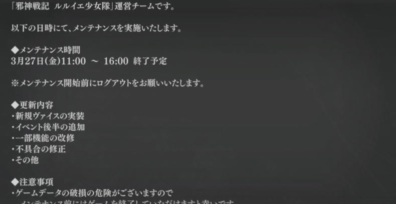 | … | 6626/03/26(木)14:39:26No.1414399279+>明日はメンテ延長あり得るのだ? |