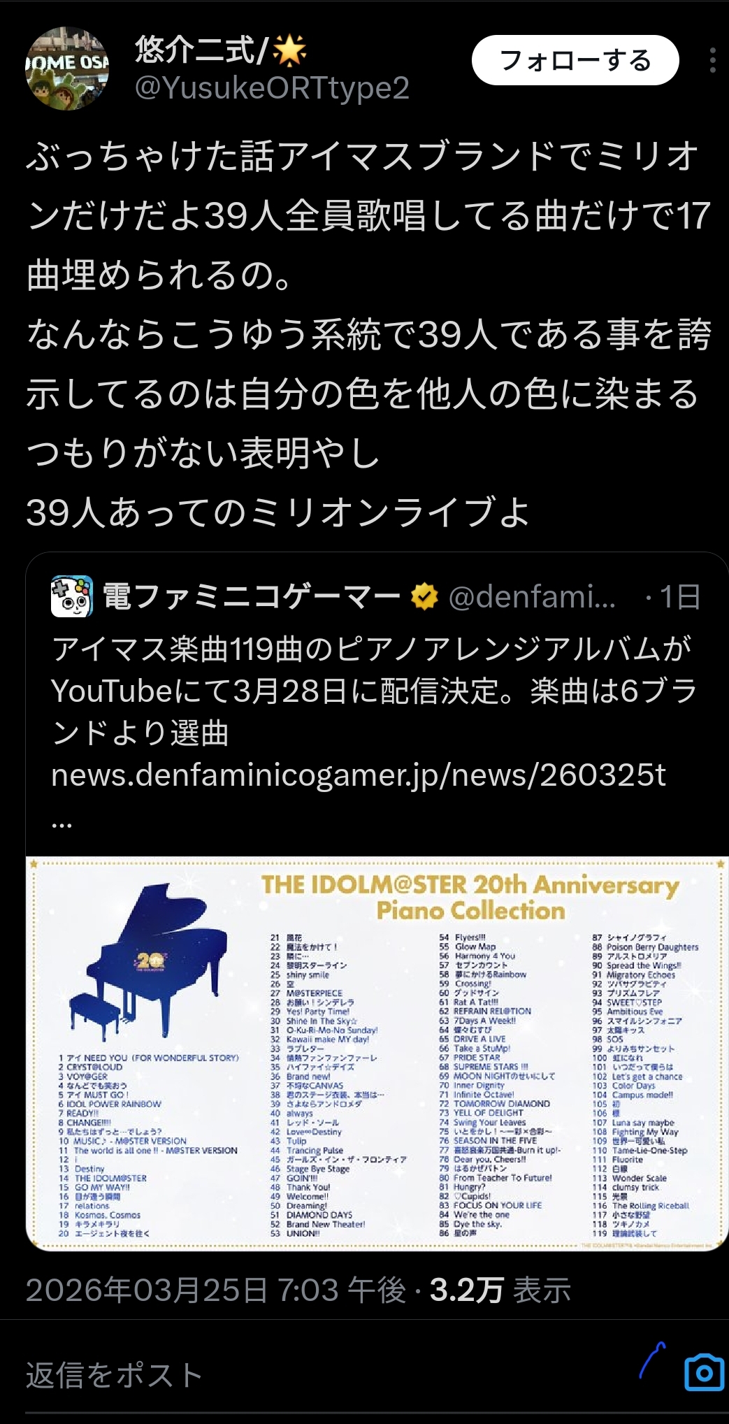 | … | 926/03/26(木)17:07:43No.1414428160+>デレマスは物理的に全体曲何個も出すの無理やろ |