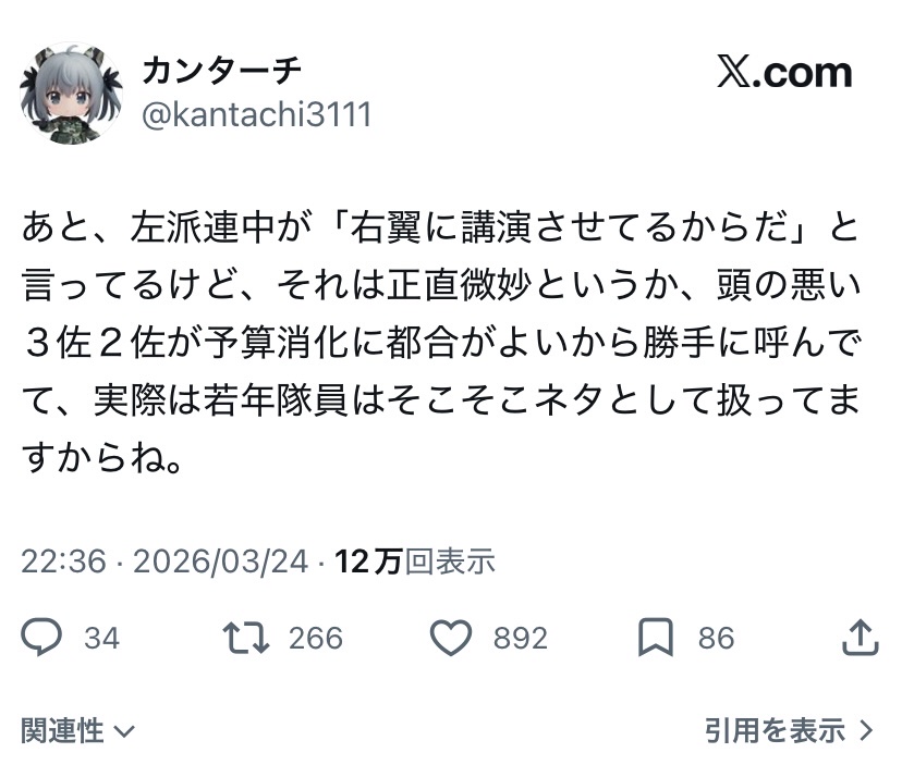| … | 6126/03/26(木)17:59:54No.1414441498+>>>防衛大「ネトウヨたくさん呼んで講演させて学生を極右化させるぞ!」 |