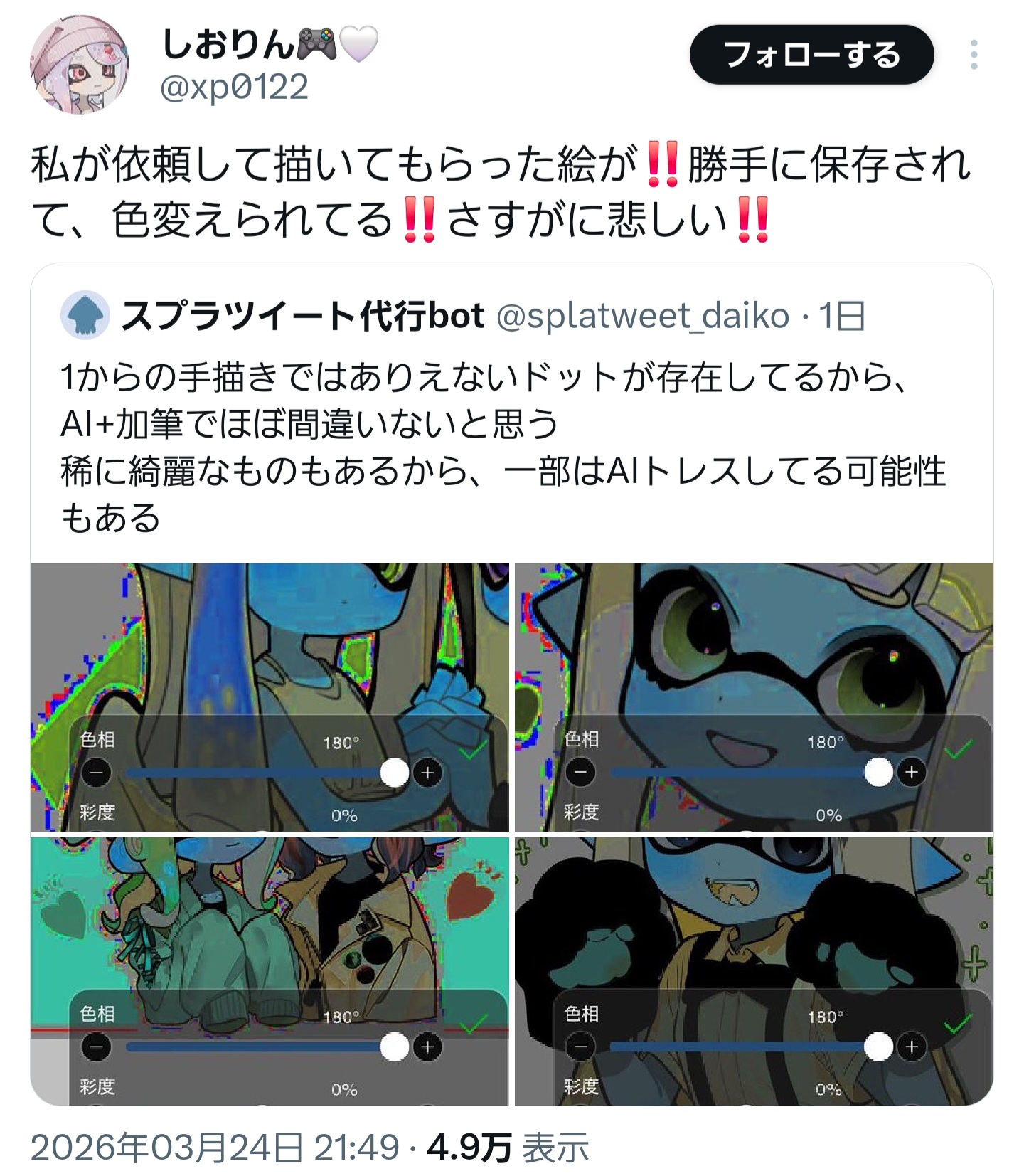 | … | 2126/03/26(木)22:18:03No.1414527542そうだねx24反AIの方々に於かれましては「こんなバカの同類」というレッテルを貼られる前にそろそろ身の振り方を考え直したほうがいいと思う |