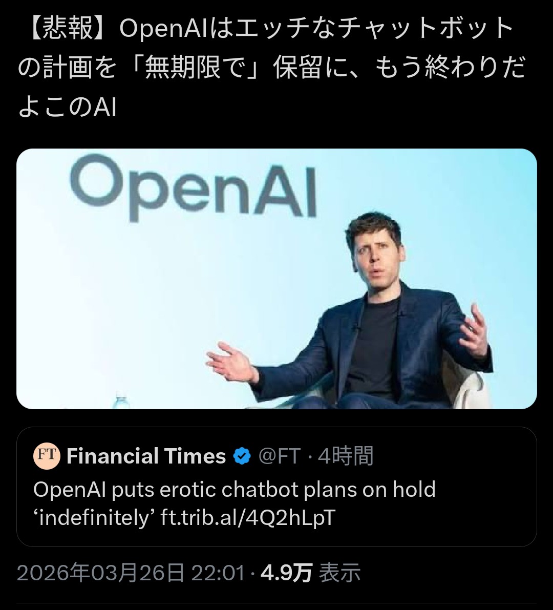 | … | 6826/03/27(金)01:30:12No.1414586789+俺はまだサム・アルトマンを信じてる |