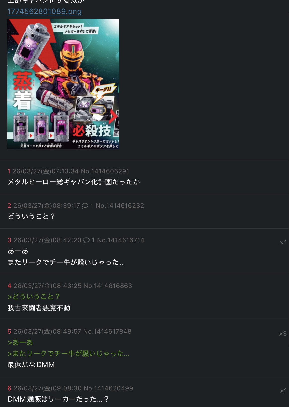 | … | 626/03/27(金)10:38:57No.1414636463+ジライヤネタももう使っちゃうのか… |
