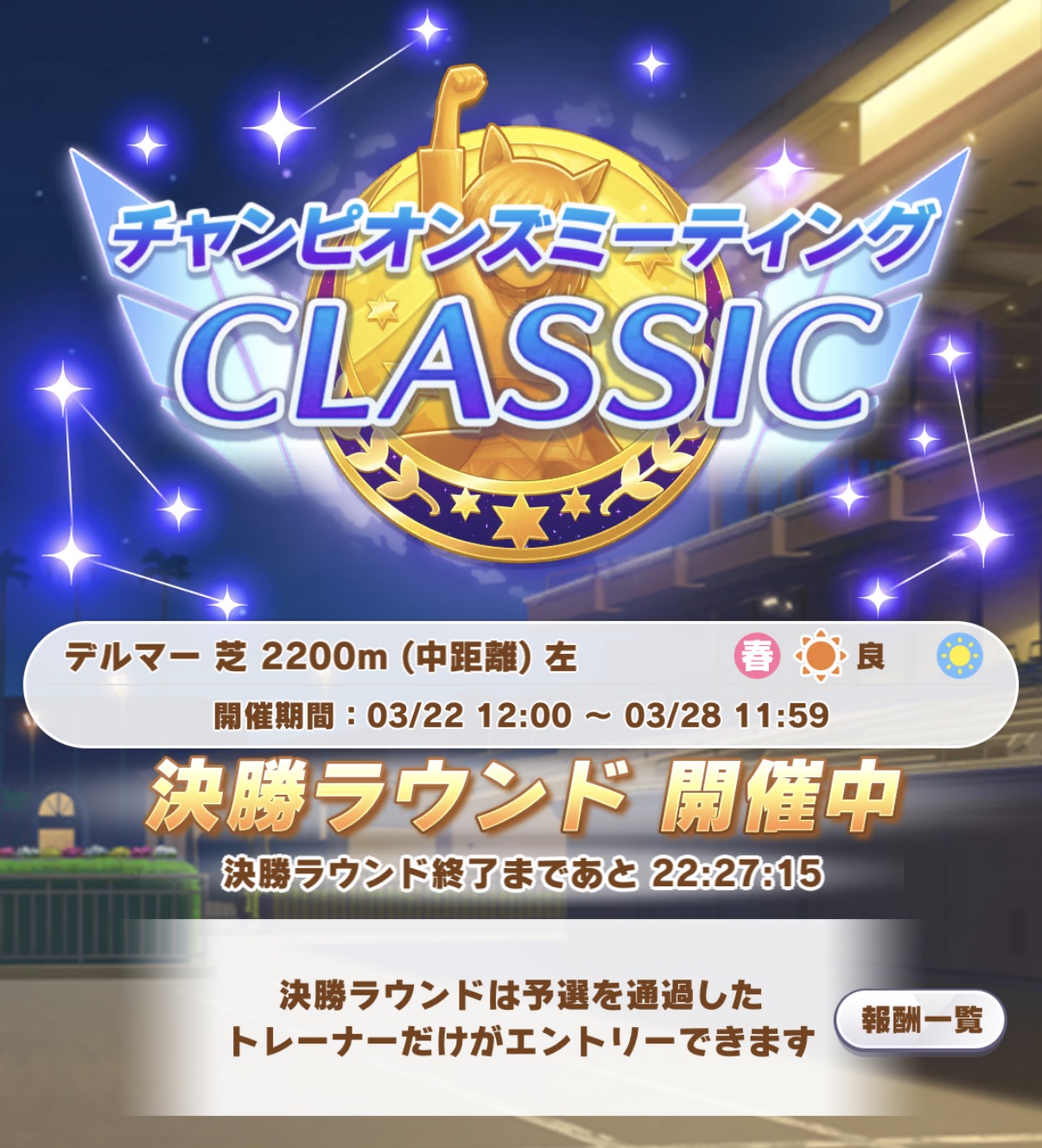 | … | 3926/03/27(金)13:39:50No.1414677879+>テレッテーテーテーテーテーーテーーテーーみたいな奴です >曲名は分かりません えっと…いつものチャンミのBGMでよろしいんでしょうか…? あと負けた時のBGMなら殿堂入りウマ娘一覧画面で流れてるアレです |