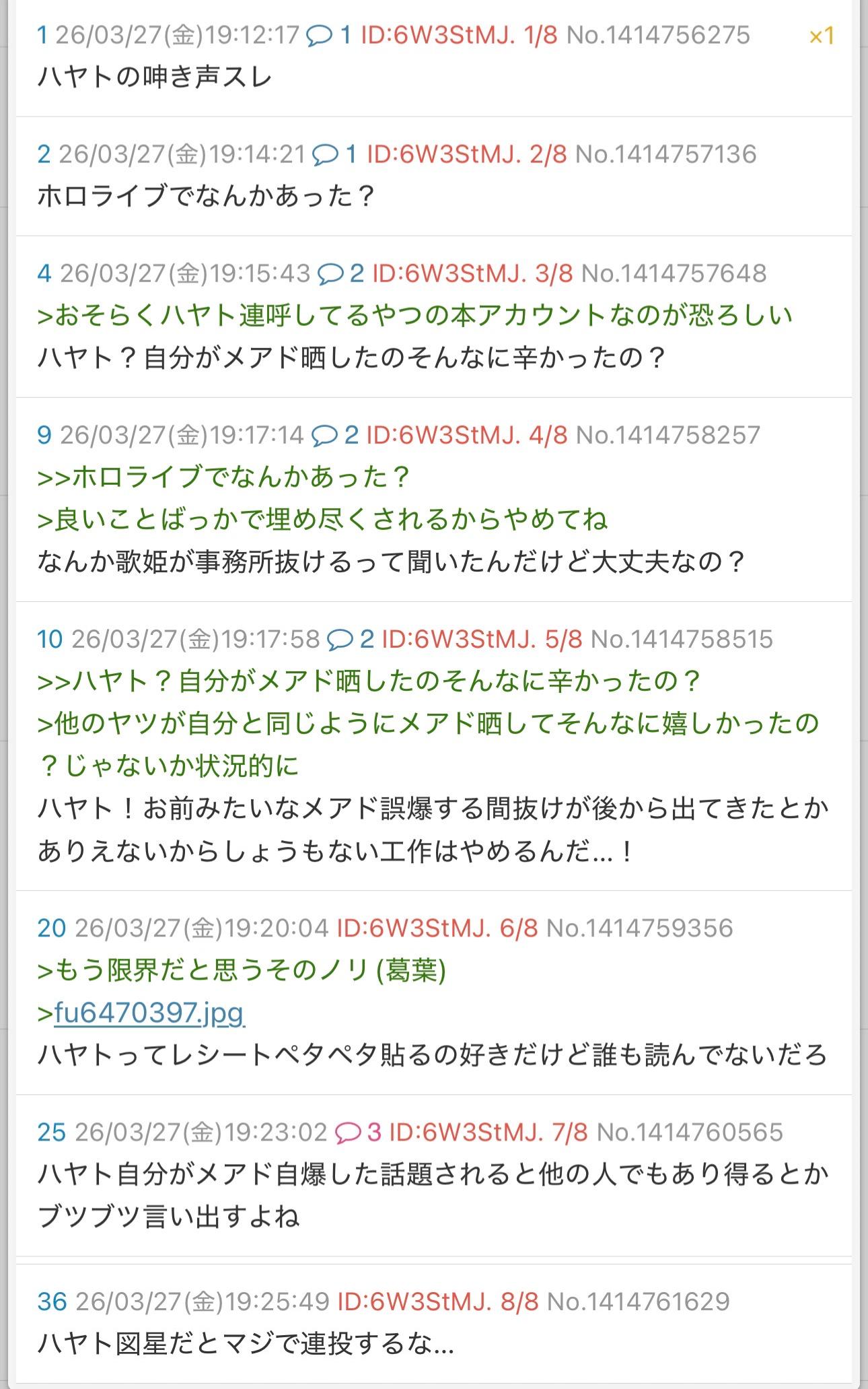 | … | 426/03/27(金)19:15:43 ID:6W3StMJ.No.1414757648+>おそらくハヤト連呼してるやつの本アカウントなのが恐ろしい |