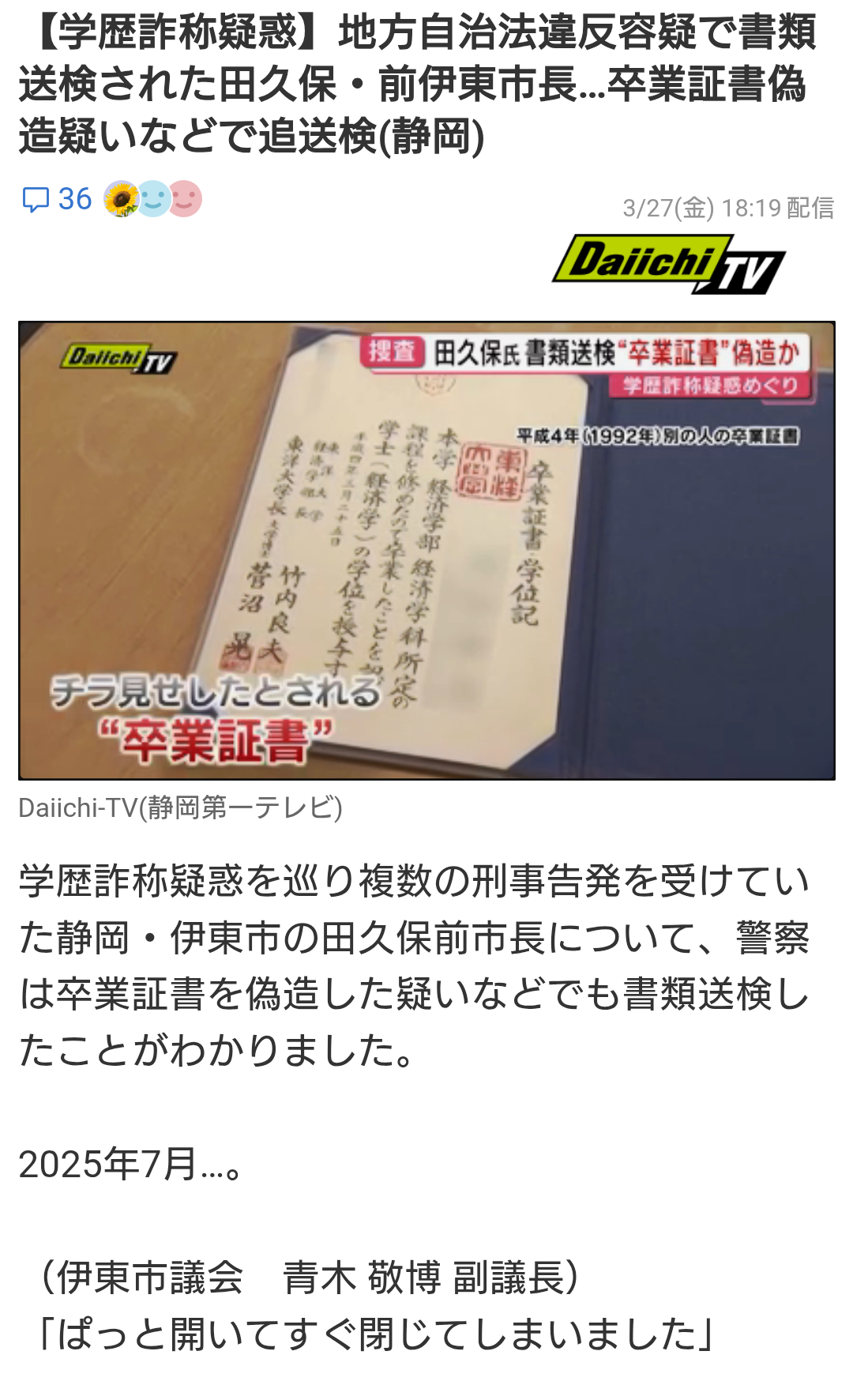 | … | 2526/03/27(金)19:43:47No.1414769055そうだねx14学校ははっきり除籍済みって言ったし本人も卒業してないことを認めた→公職選挙法違反 |