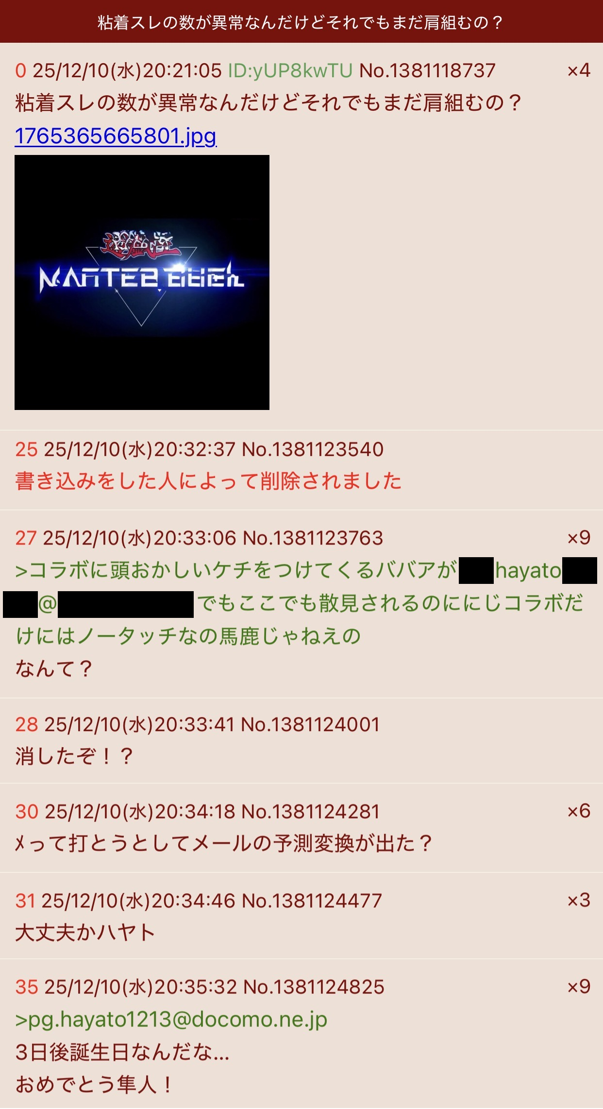 | … | 1426/03/27(金)20:12:32No.1414782095+該当する荒らしが無様晒してハヤトと呼称される原因を自ら作った当時と変わらない言動で連日糞スレを立て自演バレしてる頭の弱い奴がいるのは現在進行形で確認されてるがそれが確実に同一存在か証明できるかというと難しいだろう |