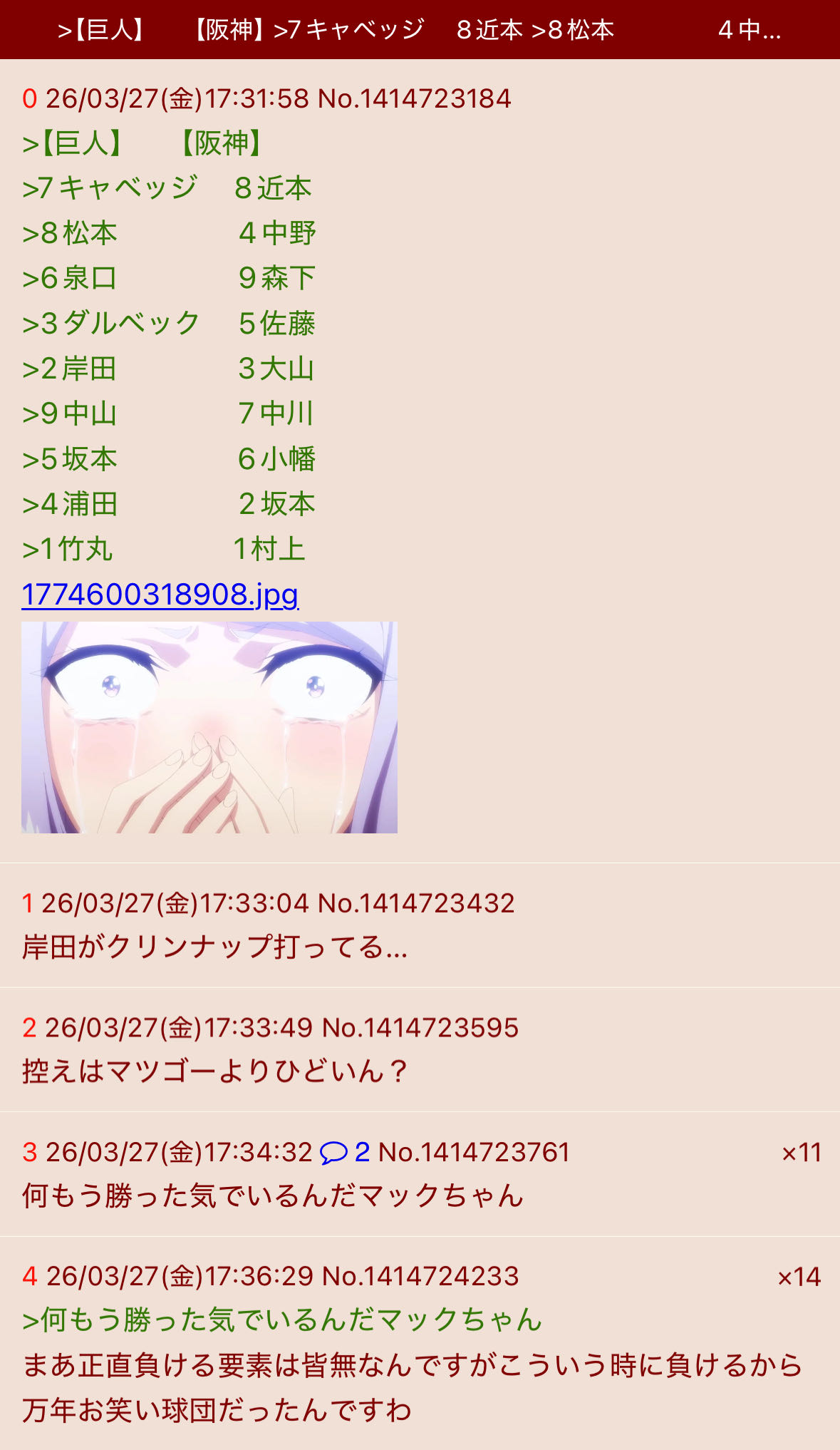 | … | 7626/03/27(金)21:19:35No.1414817932+なんか試合前に予祝スレ立ててなかったマックちゃん? |