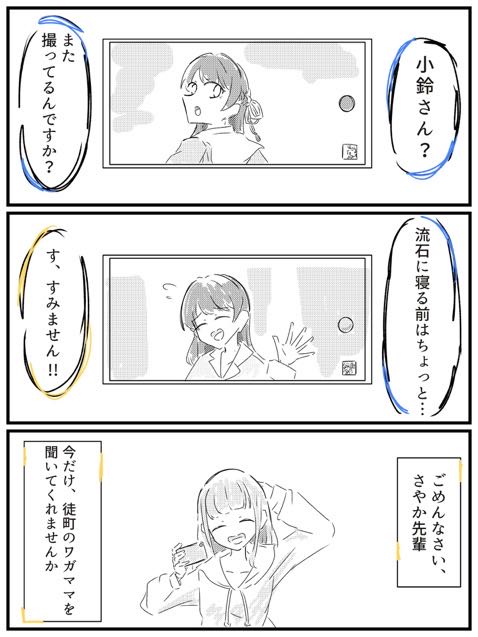 | … | 4726/03/27(金)22:05:25No.1414840923+>徒町は動画 >姫芽は写真 >吟子ちゃんは何してるの 床に寝転がってる |
