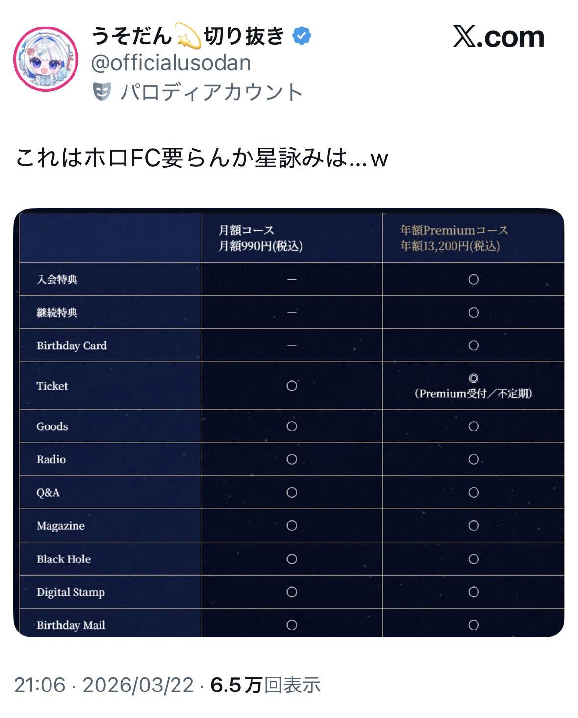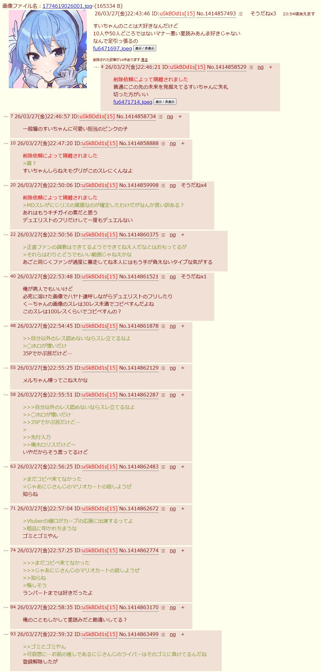 | … | 4326/03/27(金)22:54:02No.1414861607そうだねx13ファンのフリしたアンチが居るって色々なホロメンから言われててバレてるのに懲りないね |