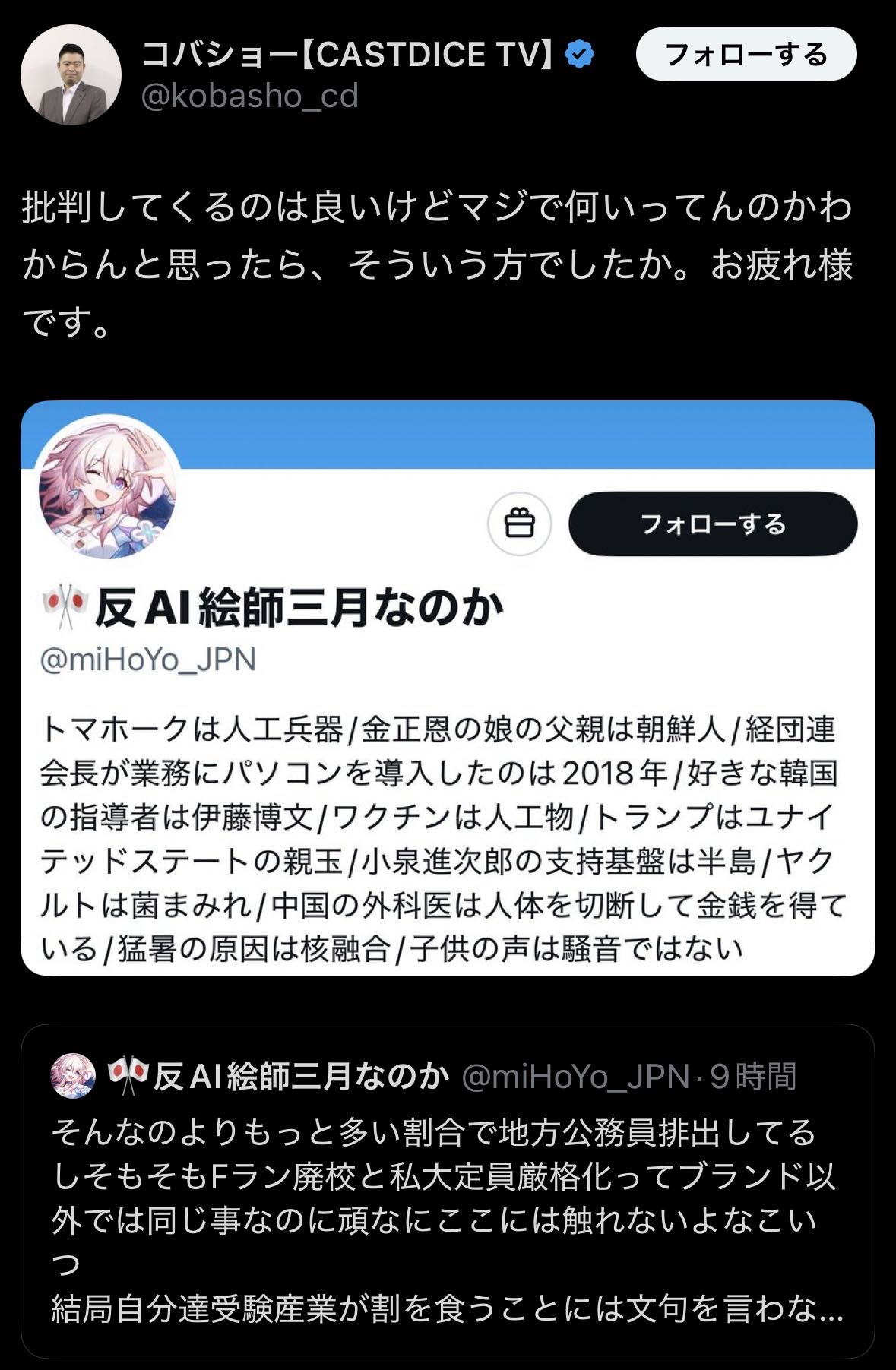 | … | 6626/03/28(土)02:25:36No.1414917868+当たり前のことを書くってネタなんだけどなんか多種多様なタイプのヤバい人に攻撃されてるアカウント |