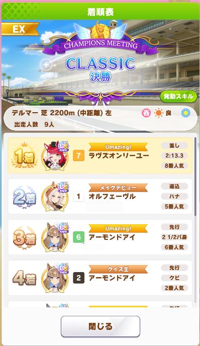| … | 8826/03/28(土)10:31:55No.1414965300そうだねx1>なんというか先行のつもりが先頭立って逃げみたいになっちゃったとか >レース展開によって立ち位置変わった時に逃げスキルが発動してフォローできたとか 先頭にいたら〜みたいな条件なら先行でも発動しますが <逃げ>になってるスキルは先行で走ってたら発動しませんよ |