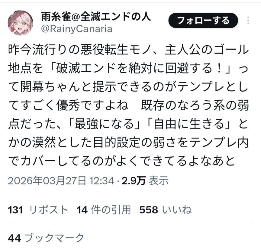 | … | 4826/03/28(土)13:55:48No.1415017550そうだねx3悪役令嬢モノは目的云々より負のご都合主義の方が気になる |