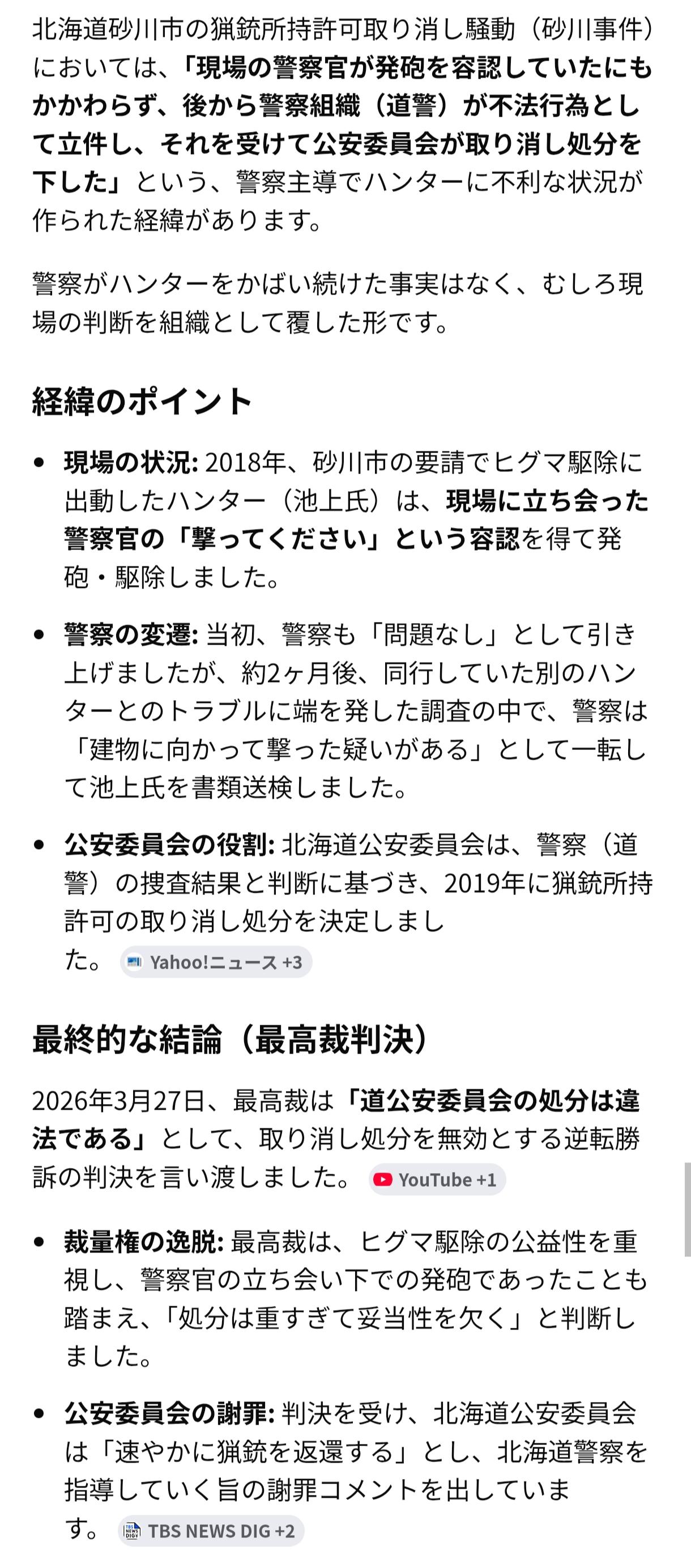 | … | 9026/03/28(土)14:03:43No.1415019930+>発砲自体の違法性は最高裁でも認めてるんだよね |